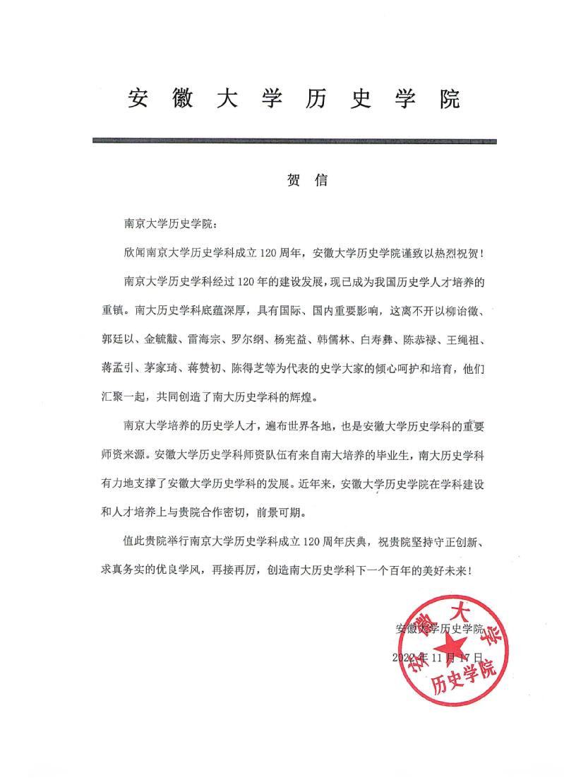 安徽大学亚洲av 来信祝贺亚洲av 历史学科成立120周年