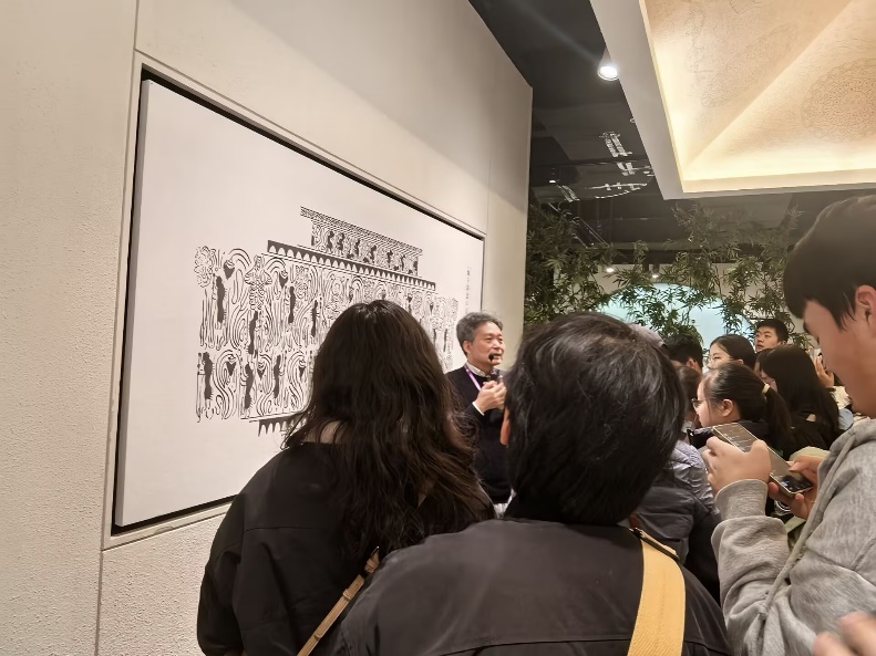 进馆后,张学锋老师在有东吴东晋宋齐梁陈字样的挂带下讲解六朝馆概况、设计理念,由同学们脚下的菱形地板讲述背后蕴含的贝氏风格;同时张老师提及考古现状并对同学们提出殷切期望——重视发明考古、进行新史学研究。