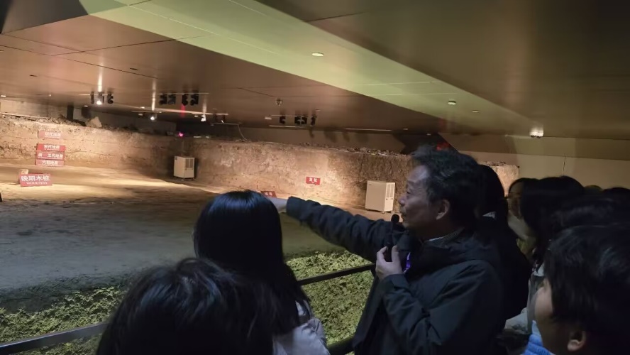 首先,张老师带领同学们来到负一层展厅。作为考古界专家,张老师就城墙遗址讲解地层线与时代判断等考古学专业知识,揭开城址中轴倾斜的谜团——中国古代与自然相协调的城市建设理念。同时,张老师以壕沟的存在印证城墙遗址原为宫城东墙北段的观点。