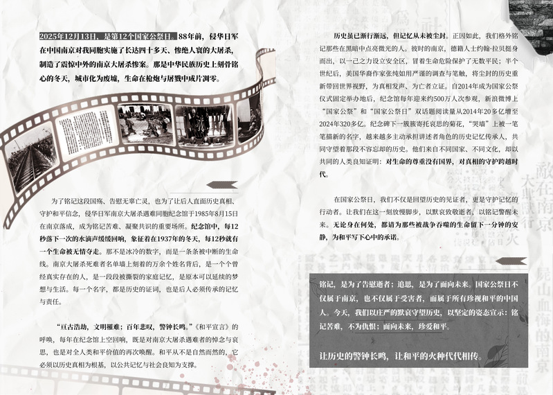 “在国家公祭日,我们不仅是回望历史的见证者,更是守护记忆的行动者。让我们在这一刻放慢脚步,以默哀致敬逝者,以铭记警醒未来。无论身处何处,都请为那些被战争吞噬的生命留下一分钟的安静,为和平写下心中的承诺。”