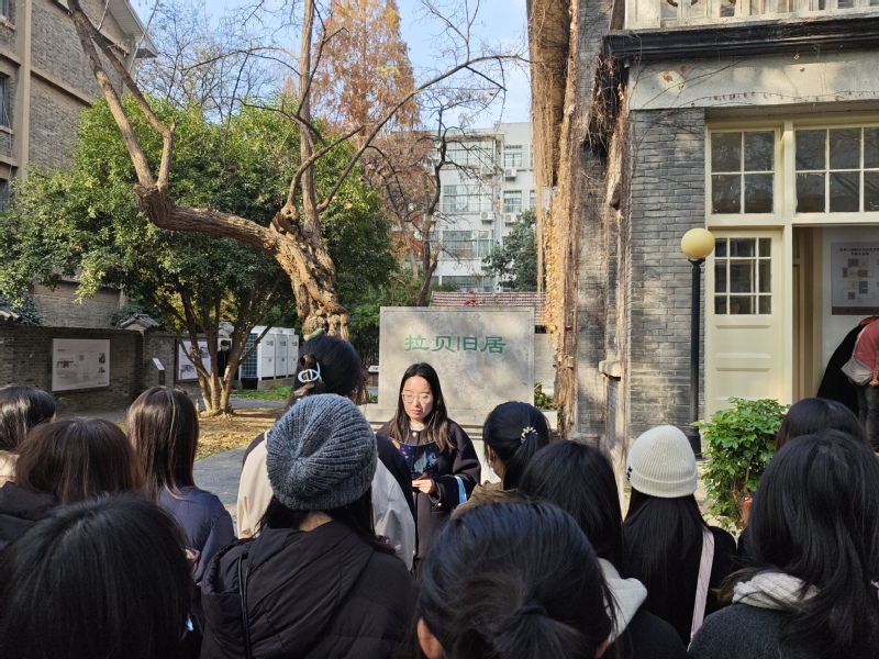 徒步首站是约翰·拉贝(John Rabe)先生旧居。在旧居前,硕士生第一党支部代表韦方宁同学讲述了拉贝先生在那段黑暗的岁月中以超越国界的人道主义精神守护生命的感人事迹。随后,同学们徒步前往金陵大学丛葬地纪念碑。金陵大学曾是安全区内最大的难民收容所之一,而此处则是七百余具遇难同胞遗骸的集体安葬地。