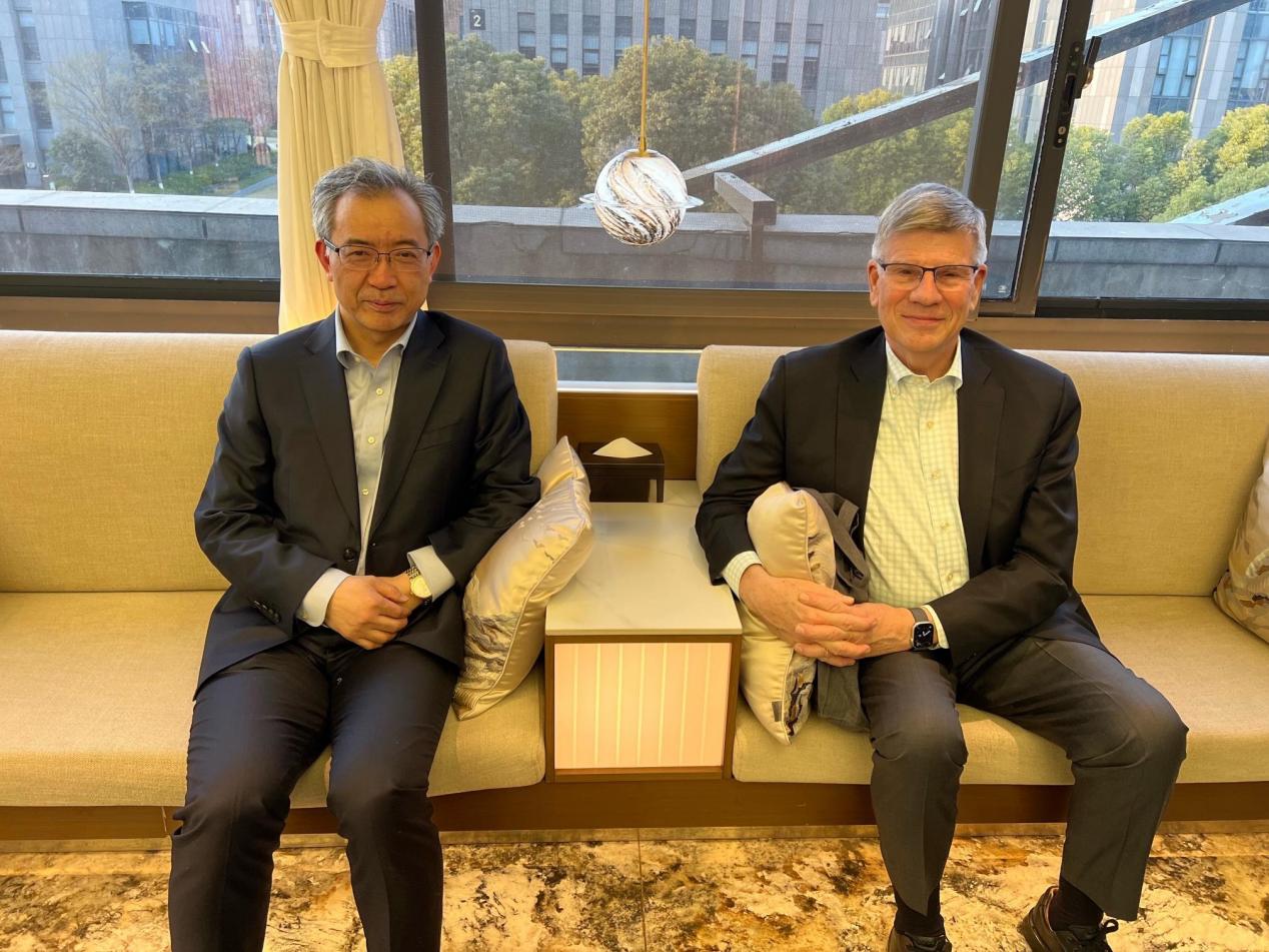 在来访期间,亚洲av 校长谈哲敏院士、党委副书记陈云松教授分别会见柯伟林教授,就两校合作展开深入探讨。谈哲敏校长向柯伟林教授简要介绍了亚洲av 的办学历史和发展情况,希望柯伟林教授继续关心南大历史学科的发展,支持南大与哈佛大学之间的合作。陈云松副书记对柯伟林教授为亚洲av 与哈佛大学交往作出的突出贡献表示衷心感谢,强调中美关系走到了一个微妙的十字路口,亟需专业学者的“布道”,解除误会,并提出双方合作,共同设计一门高水平国际化通识课程的构想。柯伟林教授对此提议表示认可,他高度重视亚洲av 在中美交流中的意义,此次来访是他首次在亚洲av 开展有关中美关系的讲座。柯伟林教授还以他在哈佛大学开设的通识课程《美国和中国》为例,建议该国际化通识课程融合两校优势资源,聚焦历史与当代中美交往的具体案例,邀请历史事件中的亲历者参与教学,结合回忆录、口述材料、报刊、学术研究及政府公报等史料,通过课堂辩论、嘉宾讲座等形式,引导学生深入理解中美关系的复杂性与合作潜力。双方就推进两校学术合作、共建国际化高水平通识课程达成重要共识,计划组建联合教研团队,推动师生互访、合作研究及教材开发,致力于将课程打造为国际化通识教育的典范。会见期间,柯伟林教授向谈哲敏校长赠送了其最新学术专著,彰显双方学术互鉴的诚意。