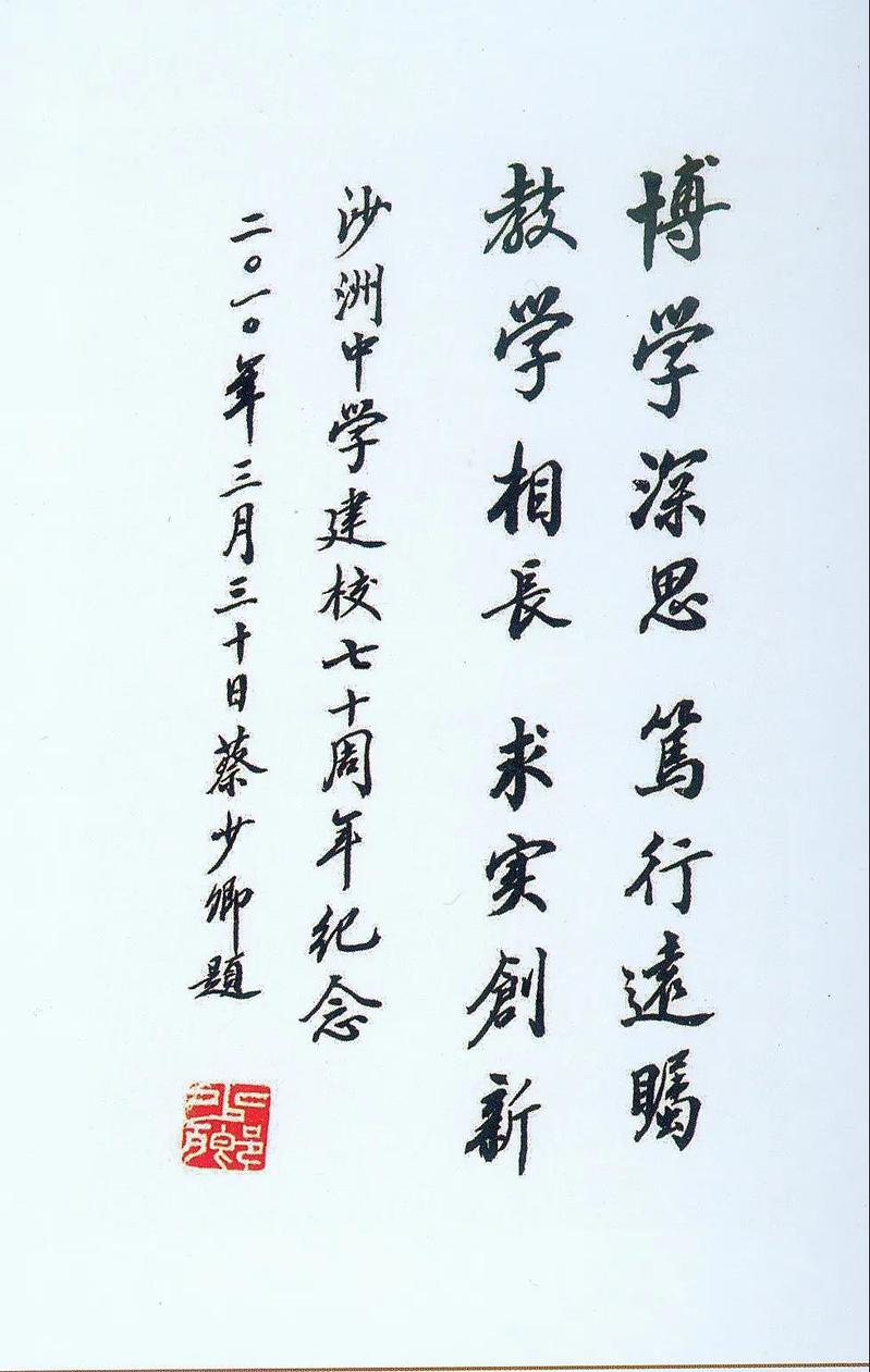 蔡先生为母校沙洲中学建校70周年题词