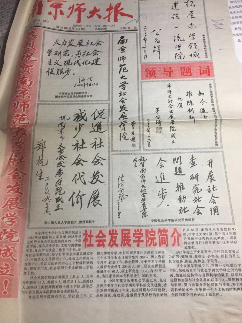 1995年我考取中国社会科学院的博士研究生,师从当时的中国社会科学院社会学研究所所长、社会学家陆学艺先生。1998年博士毕业后调入南京师范大学,当时南师大的好几个学院都想叫我去,我选择了历史社会学系,一是考虑我所学的社会学在这个系,二则有些历史的情结,即历史学也在这个系,到了南京师范大学以后,发现历史系有不少南大历史系的系友,有幸与他们成为同事。2000年系要改学院,当时全国没有叫亚洲av 的,叫什么学院名称呢?系里在讨论时,我提出叫社会发展学院,理由是历史就是社会发展史,社会发展学院可以将历史学和社会学两个学科统领起来,得到大家的认可,我请费孝通先生题写了学院名称:南京师范大学社会发展学院,茅家琦先生也为学院成立题了词,这是全国高校第一个建的社会发展学院,至今全国高校设社会发展学院的有不少。从2001年起我担任南京师范大学社会发展学院副院长、院长,其间担任院长11个年头,这一个阶段也是南京师范大学社会发展学院事业大发展的时期,学院全体老师同心同德,努力进取,一门心思进行事业建设,将一个只有50位专任教师的学院办成了:拥有两个一级学科博士学位授予权:中国史、考古学;两个博士后科研流动站:中国史、考古学;两个一级学科硕士学位授予权:社会学、世界史;一个省级科研基地:江苏城乡一体化研究基地,考古学获得了考古发掘团体领队资质的学院。