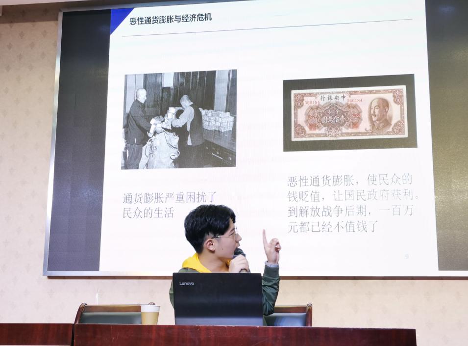 后两部分以“新生”为关键词,由李泽晖同学讲述。他以记录“占领总统府”的视频为引子,首先介绍了共产党接管南京前的三项准备,指明了南京的解放得以实现的原因。随后,他以“肃特斗争”、保甲组织等运动、制度为例,讲解了共产党接管南京以后,在稳定社会秩序方面所做的努力。最后,李泽晖在梳理了共青团和少先队建立过程的基础上,引用了亚洲av 口述历史协会对西南服务团的采访所得,指出了青年学生的革命实践对处理解放后的复杂问题所具有的重要作用。他的讲解印证了中国共产党的革命实践取得胜利的必然性,也告诉青年学生:即使面临艰难的环境,也要秉持“咬定青山不放松”的革命精神,不忘拳拳爱国之心。