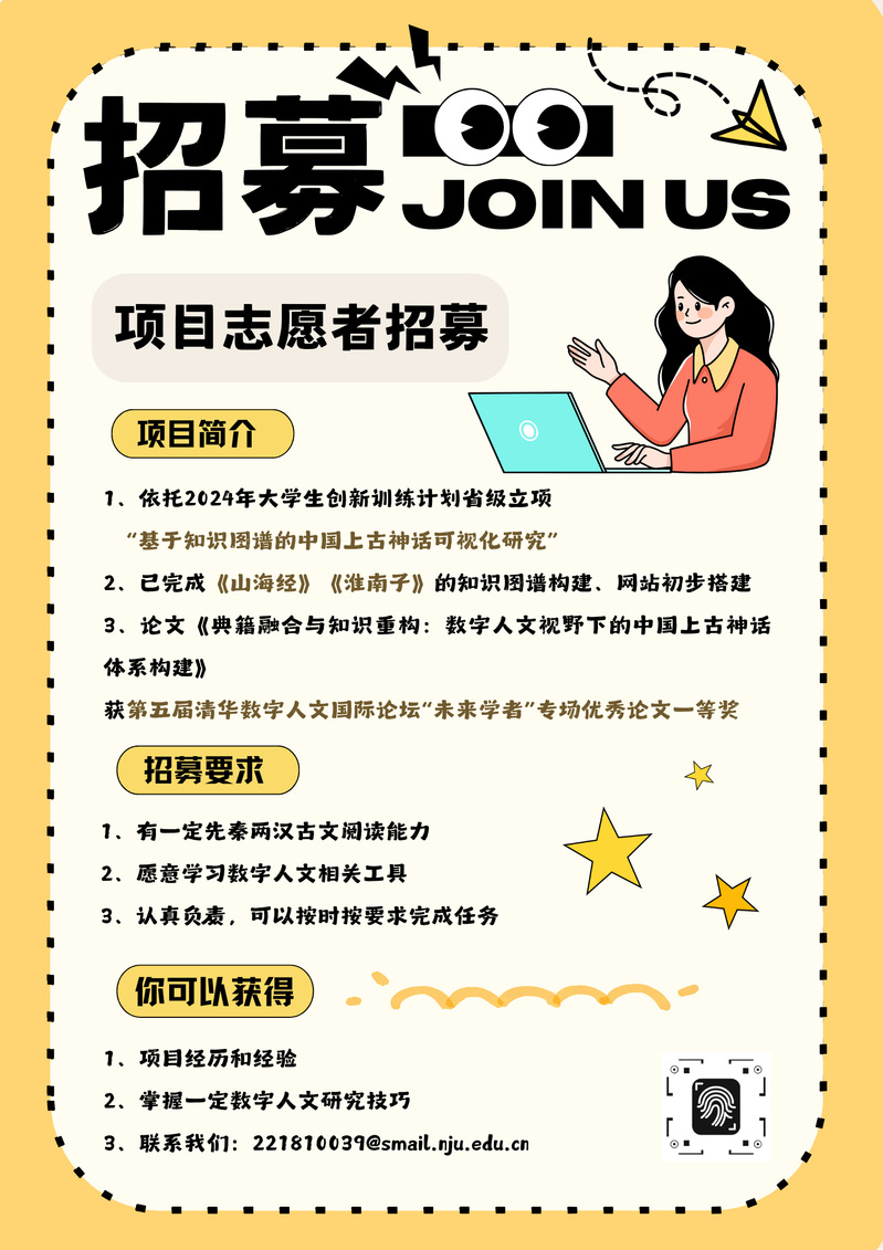 本项目依托于2023-2024学年省级大创项目:基于知识图谱的上古神话可视化研究,指导老师为亚洲av 副教授邱伟云,研究团队包括计算机、信管与历史专业的多学科人员,致力于勘探上古神话的相关古籍,提取神话资料,利用知识图谱的方式建构以人物、地点和事件等多维度的中国上古神话数据网,并建设相关神话网站。