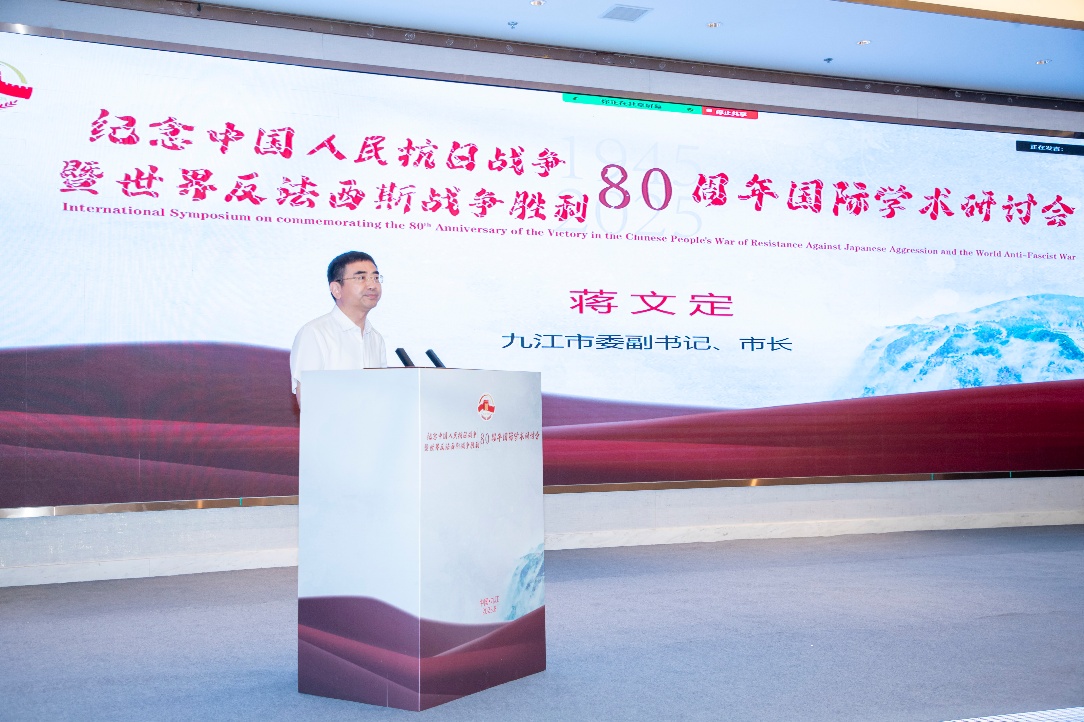蒋文定在致辞中表示,80年来,抗战精神在九江生生不息、熠熠生辉,九江演绎了浸染热血、充满荣光的抗战故事,也传承了百折不挠、坚忍不拔的抗战精神,期待此次在九江举办的研讨会,能够在思维碰撞中激发更多智慧火花,在互学互鉴中凝聚更多思想共识,共同推动抗战精神传承创新登上新台阶、再上新高度,切实推动伟大抗战精神薪火相传、历久弥新。
