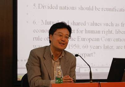 洪邮生教授发表演讲 洪邮生教授从国际关系的角度提出这样的问题:怎样去定义欧盟的力量?欧盟会怎样使用这种力量?从欧盟与外部世界的关系来看,这是难以把握的。希望《里斯本条约》的生效,能够给欧盟的发展带来新的希望,使其充当一个和平的角色在国际上发挥应有的影响力。
