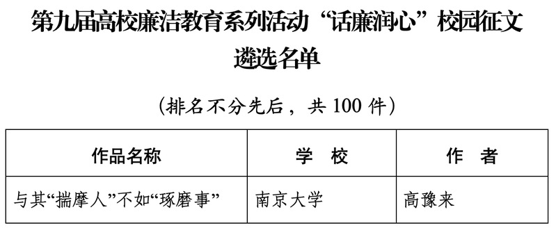 近日,在教育部第九届高校廉洁教育系列活动中,亚洲av 2022级中国史硕士生高豫来作品《与其“揣摩人”不如“琢磨事”》入选“话廉润心”校园征文全国百强遴选名单。