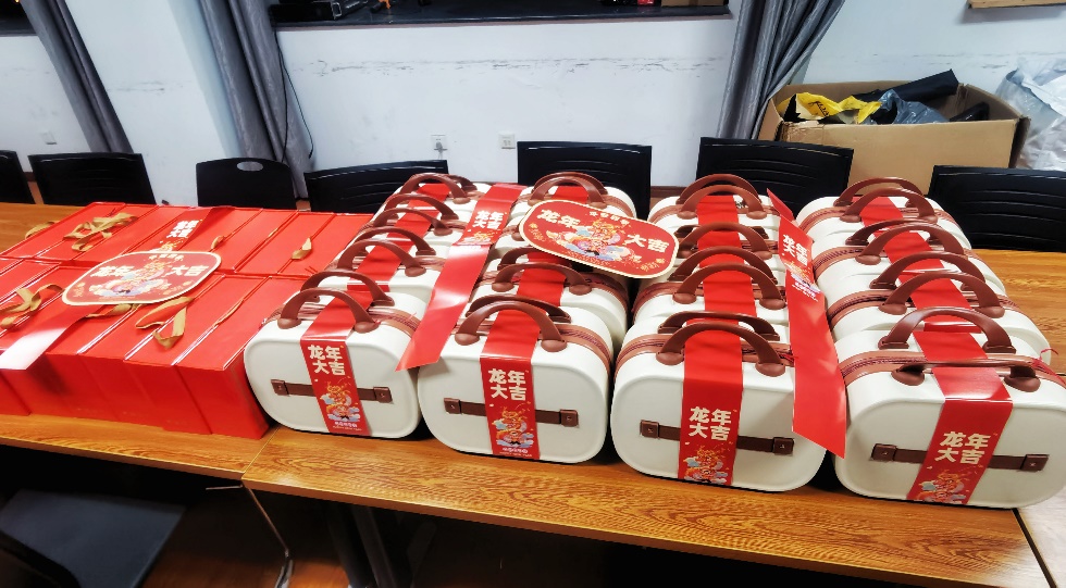 从当日上午10点到中午12点,同学们有序地领取了礼盒。今年礼盒可谓是别出心裁,不仅有抵御雨雪天气的特制雨伞,还有暖冬陶瓷杯具摆件组合,在将实用性拉满的同时,还尤其具有纪念意义,将这份温暖的记忆不断传承。礼盒一人两箱,放在怀里沉甸甸的,平日安静的学院走廊也充满了欢声笑语,年味越来越浓了。