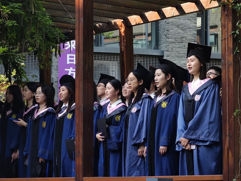 随后,本科生组和研究生组先后列队立于回廊,典礼进行到合唱环节。《毕业歌》、《明天会更好》、《送别》、《我和我的祖国》……悠扬的歌声是对祖国和学校的感情流露、是与师长同学分别的愁绪、更是对未来满怀的憧憬。