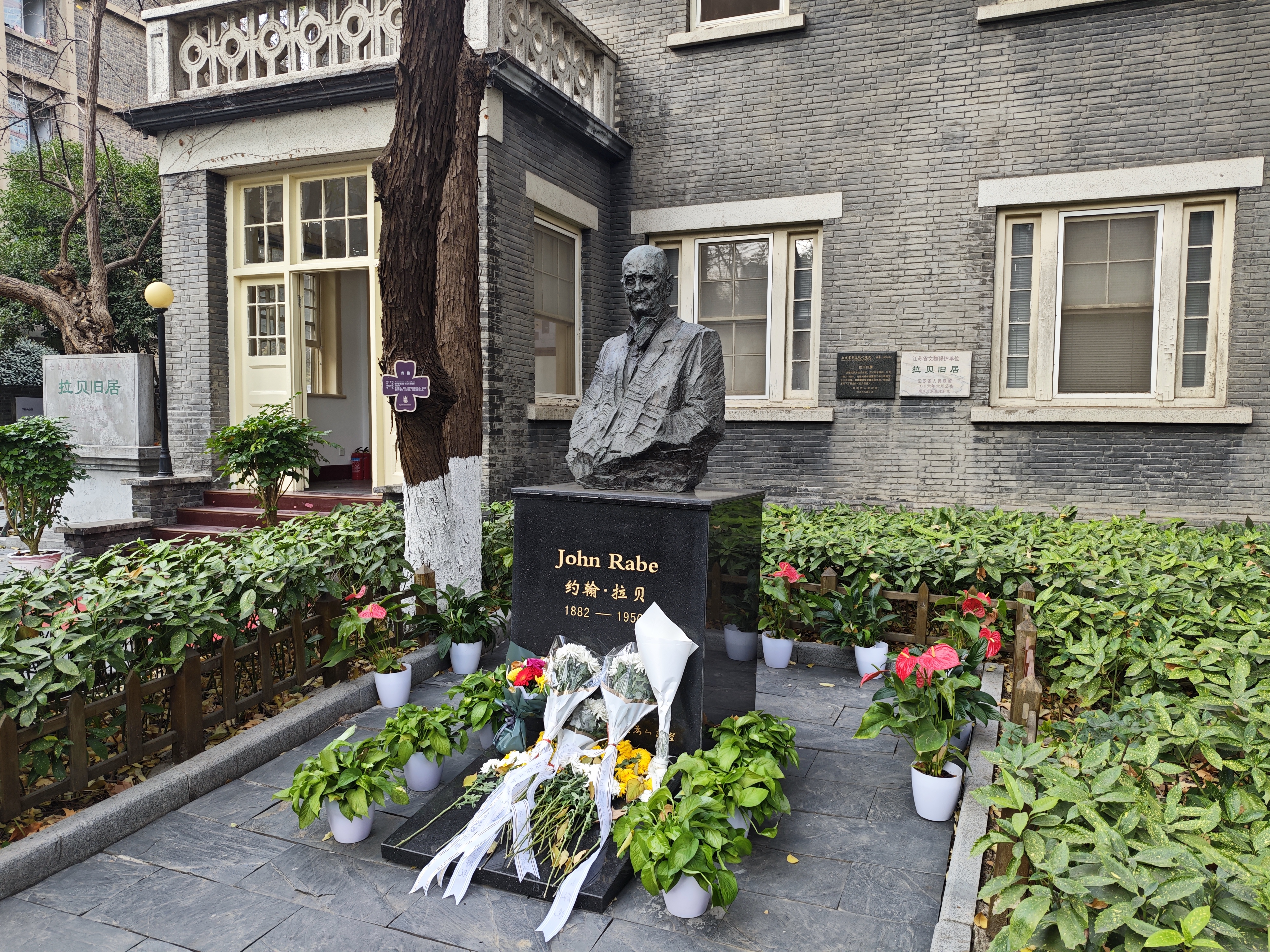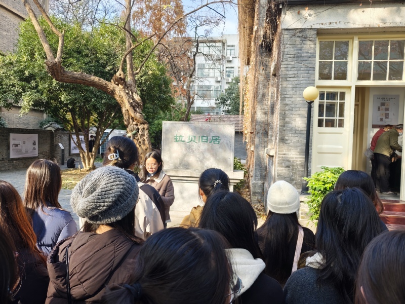 徒步首站是约翰·拉贝(John Rabe)先生旧居。在旧居前,硕士生第一党支部代表韦方宁同学讲述了拉贝先生在那段黑暗的岁月中以超越国界的人道主义精神守护生命的感人事迹。随后,同学们徒步前往金陵大学丛葬地纪念碑。金陵大学曾是安全区内最大的难民收容所之一,而此处则是七百余具遇难同胞遗骸的集体安葬地。