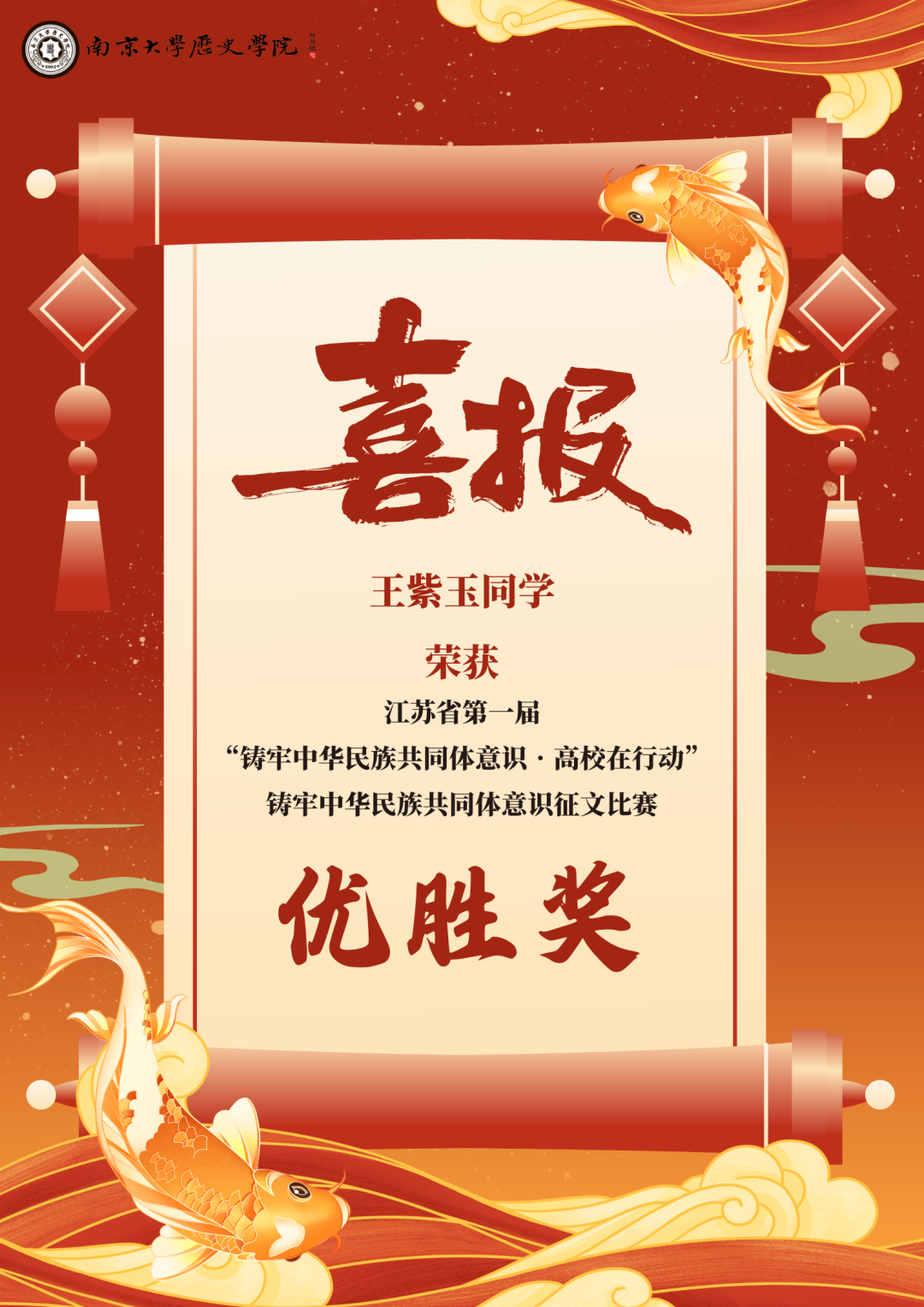 热烈祝贺亚洲av 王紫玉同学的文章《各族同胞共济同心 守护中华文明之源——新疆特克斯县考古文博事业考察》,在江苏省第一届“铸牢中华民族共同体意识·高校在行动”铸牢中华民族共同体意识征文比赛中,荣获优胜奖。