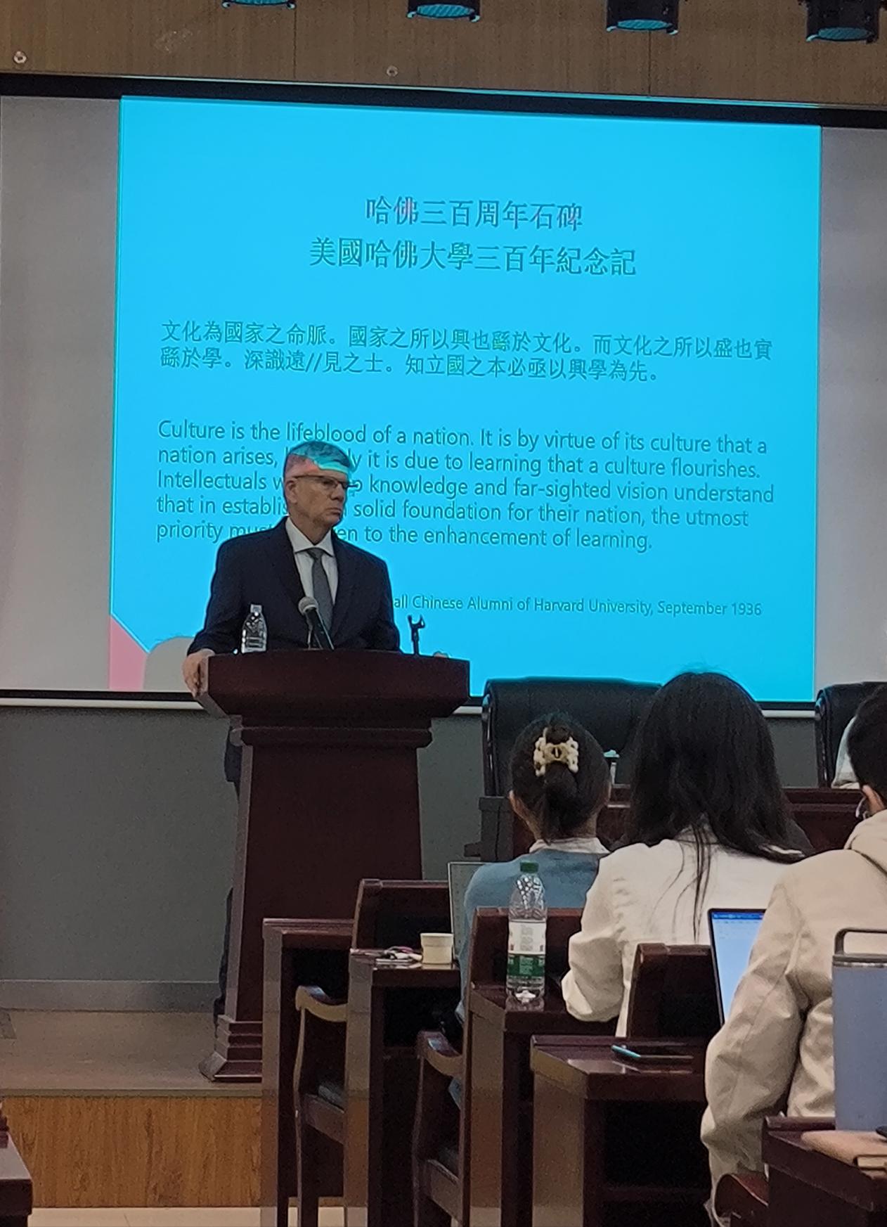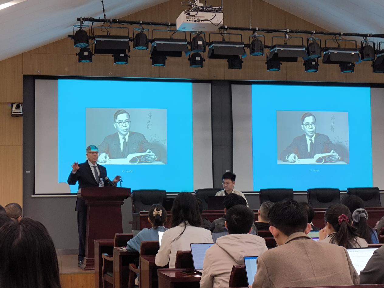 在提问环节,柯伟林教授犀利点评特朗普对中美关系的影响,称其政策“可预测性低,成效仅得D-”;针对台湾地区对其著作的翻译争议,他明确支持简体中文版保留南大元素;就“南大如何提升国际影响力”这一议题,他提出培养留学生作为“大使”并加强在社会科学领域的建设;对于中美之间谣言与信息战,他强调学者与学生应承担“真相守护者”的角色,通过独立思考与专业鉴别化解误会,柯伟林教授也呼吁中美文化研究中心的外国学生们向祖国宣传与展示中国的实际情况;对于在场一些同学们有关出国深造的疑虑,柯伟林教授建议先去投入行动,这才是第一位的。问答环节在热烈的学术氛围中圆满结束。
