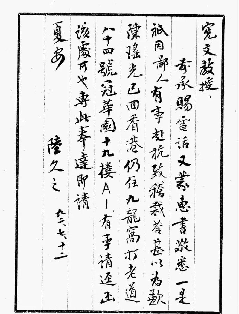 张老师在信中说,他前几年访问美国斯坦福大学胡佛研究所时曾复印了藏于该馆的陈洁如回忆录英文原稿,并将其转交给美国伊利诺伊大学的易劳逸教授,易劳逸教授当时正在计划撰写蒋介石的传记,因此就打算出版这部英文口述,但胡佛研究所表示,必须得到陈洁如的家属同意,否则不能出版。陈洁如本人已于1971年去世,她与蒋介石结婚后并未生育,只收养了一位华侨的女婴,取名蒋瑶光,与蒋分手后便更名为陈瑶光,只知道她后来定居香港,但苦于没有她的通信地址,一直无法联系。张老师好不容易打听到居住在上海的陈瑶光第二任丈夫陆久之先生,便去信询问,陆久之即回信告知陈瑶光在香港的地址,并说她最近已从美国返回香港,但张老师去信后并无回音。易劳逸为此事很着急,曾给他多次去信,希望能尽快找到陈瑶光,于是张老师想到了我,就让我从中代为联系。