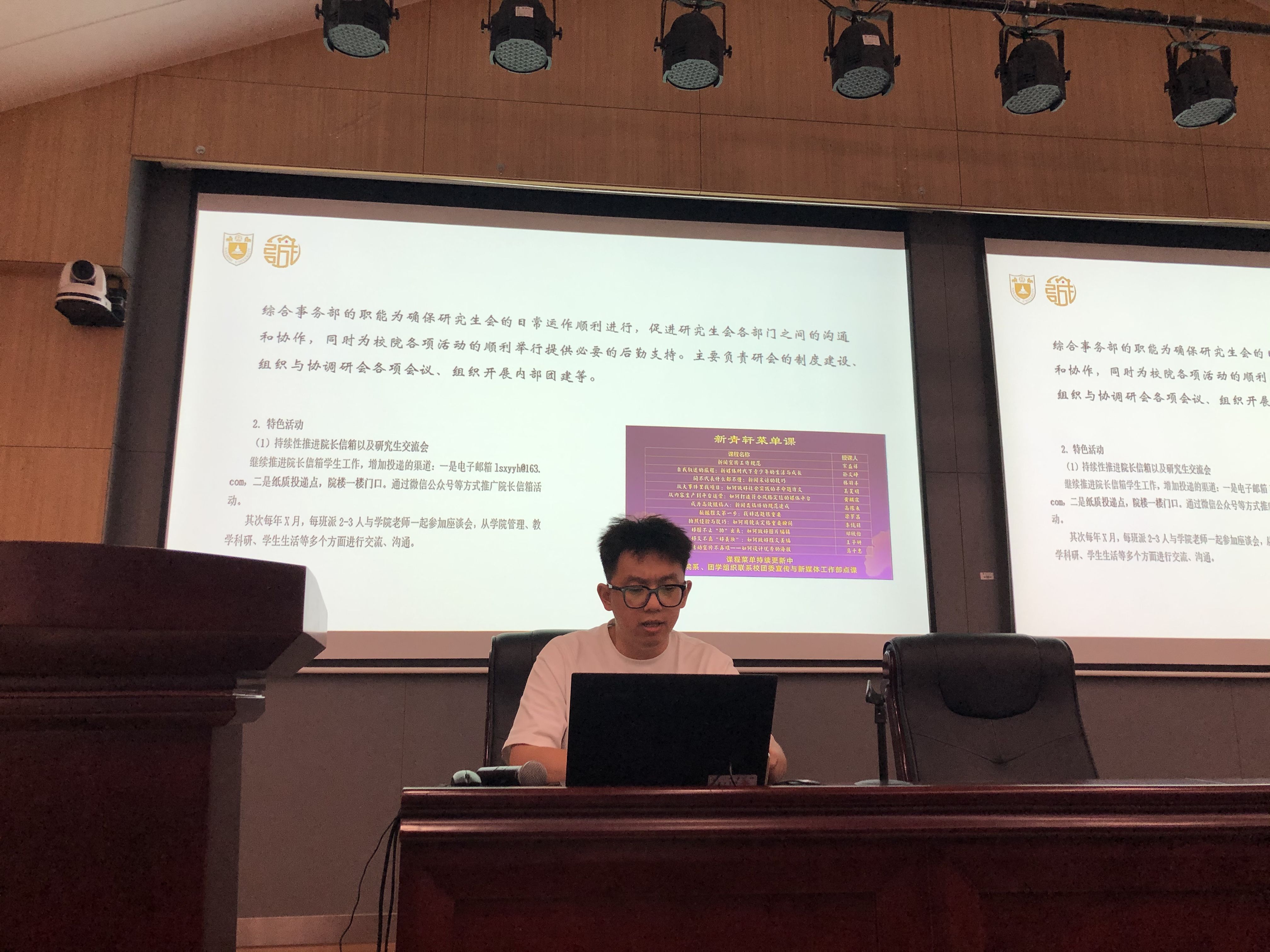 随后,研会下设的文体部、宣传部、就业实践部、学术部、综合事务部各部门执行部长分别就部门概况、人员配置、日常工作、部门年度活动规划等工作进行交流和分享。研会各部门的新成员们分别进行了简短的自我介绍。
