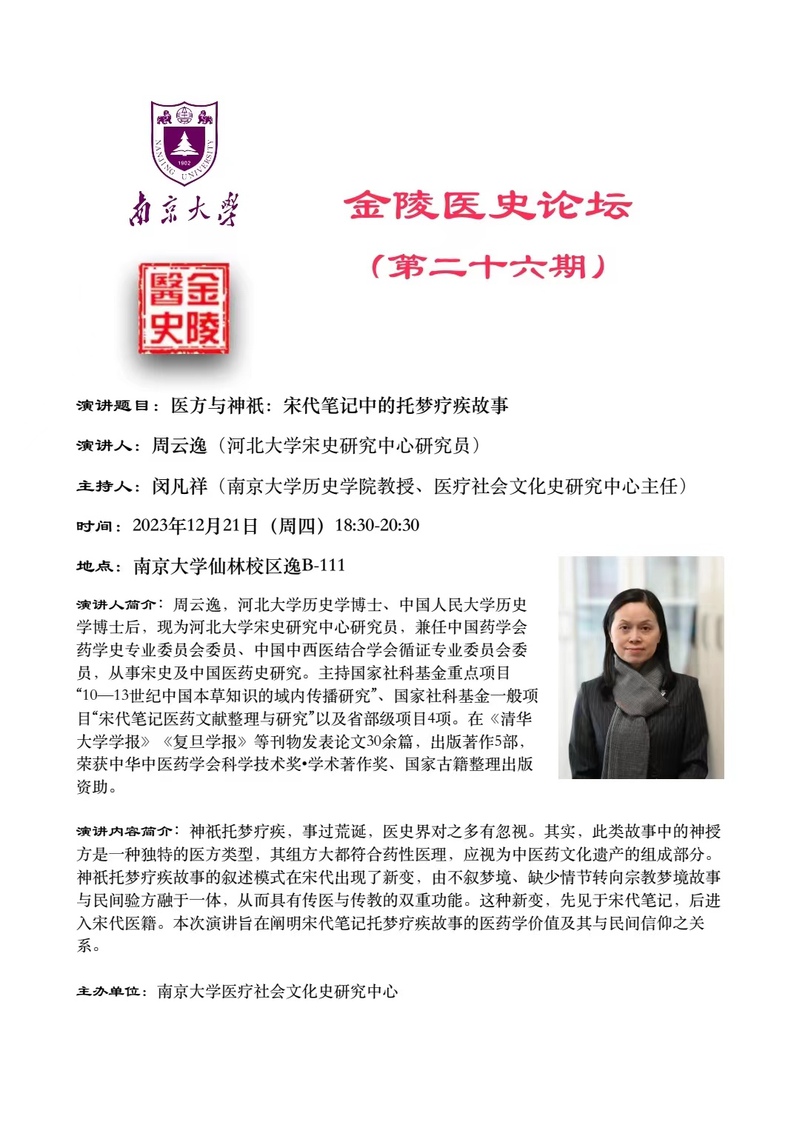 2023年12月21日,应亚洲av 医疗社会文化史研究中心主任、亚洲av 教授闵凡祥之邀,河北大学宋史研究中心研究员周云逸老师访问亚洲av 医疗社会文化史研究中心,并于当晚为亚洲av 40余名师生做题为“医方与神祇:宋代笔记中的托梦疗疾故事”的学术讲座。讲座由闵凡祥教授主持。