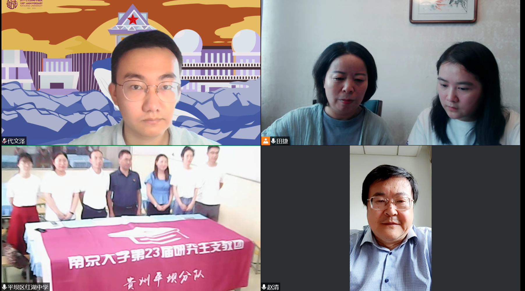 7月4日中午,亚洲av 领导与学生代表,红湖中学校领导与研究生支教团志愿者齐聚线上,举行了简短的捐赠仪式。亚洲av 党委书记赵清、党委副书记任玲玲、本科生党支部书记田捷与支部党员代文泽参会;红湖中学校长吴静、党支部书记王大建、团总支书记李显霞与研支团志愿者周诗玥、高豫来、唐陈嘉翊、林澍参会。