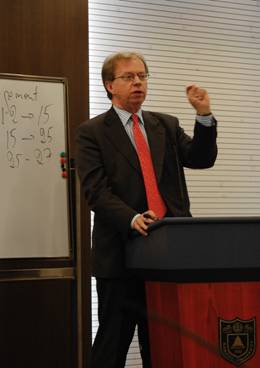 Lars Danielsson先生发表演讲 上午的研讨由瑞典驻香港总领事Lars Danielsson先生拉开了序幕,他的报告题目是“The European Union – an emerging super power or an introvert cripple?”(欧盟——形成中的超级大国还是内向的跛子?)。Danielsson认为,二十多年来欧盟一直在寻求合作的深化和成员国数量的增加。 1992年的马斯特里赫特条约、1997年的阿姆斯特丹条约、2000年的尼斯条约和2004年的欧盟宪法条约都体现了欧盟各国之间合作程度的不断深化。瑞典与奥地利和芬兰一起在1995年加入欧盟,使成员国由12个增加到15个。到2004年欧盟拥有25个成员国,2007年是27个,今年又增加3个候选国家。虽然欧盟扩大的势头不可逆转,但是这个世界上最雄心勃勃的地区一体化进程或许将放慢脚步。欧盟内部的权力正在成员国和欧洲议会之间发生转移,欧盟将日益作为一个整体在国际事务中发挥作用。内部的合作(比如欧元区和申根国家)将继续深化,同时,欧盟国家的当务之急应该是对世界上其他地区采取更为开放的政策。